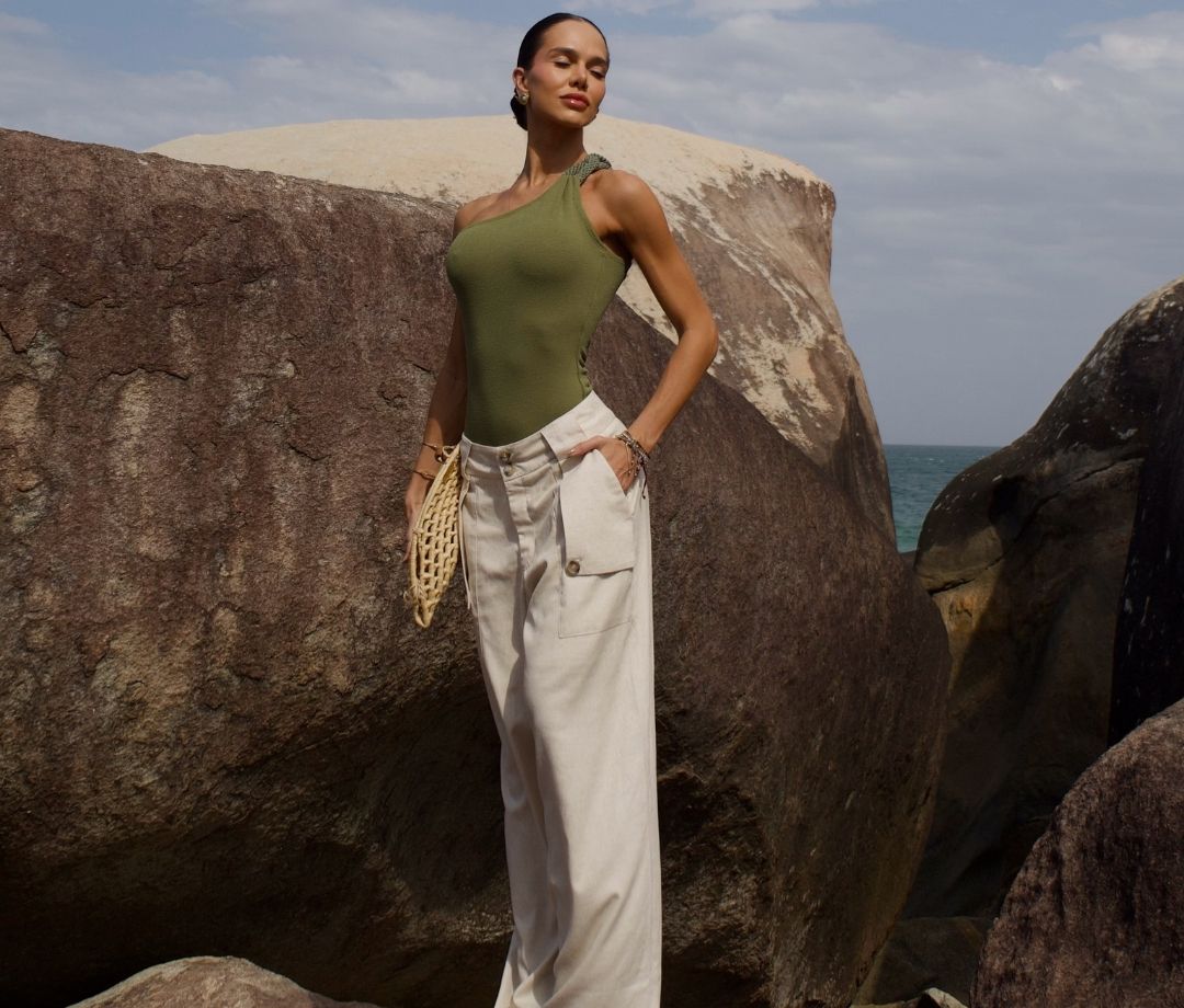 Modelagens de cintura alta, pantalonas e wide leg são ótimas para alongar o corpo, criando uma linha mais vertical no visual.
